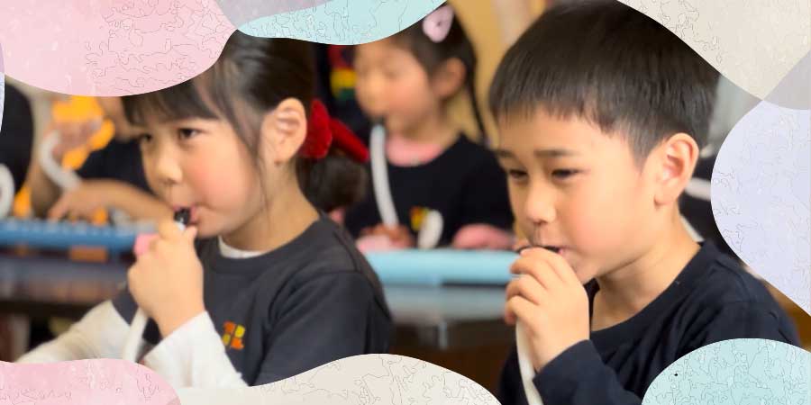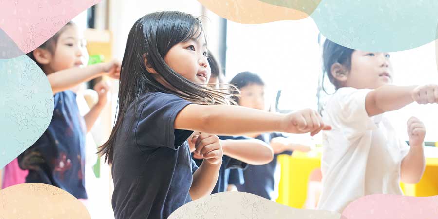 In Gym, children focus on the three physical elements: throwing, running, and jumping. In Music, children play instruments together.